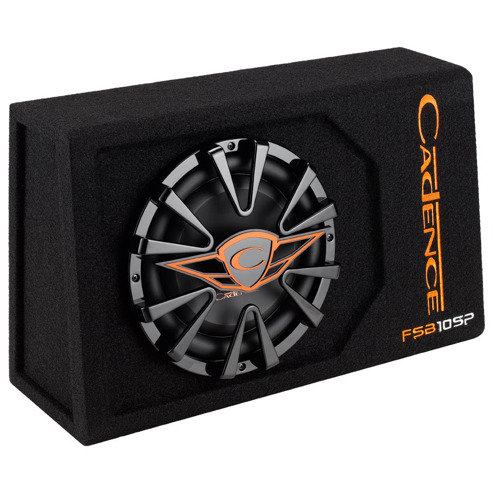 - FSB Signature Styling — Aggression Meets Elegance: Draped in premium black carpet and boldly embroidered with Cadence’s iconic orange branding, the enclosure exudes modern muscle. Its forward-facing 10” woofer is shielded by an ABS grille with a sharp, armored design that instantly elevates your trunk aesthetic.